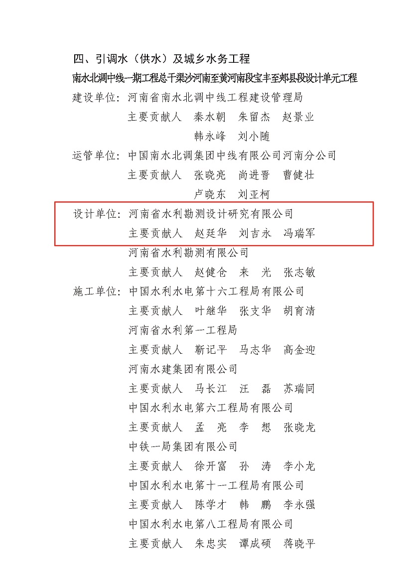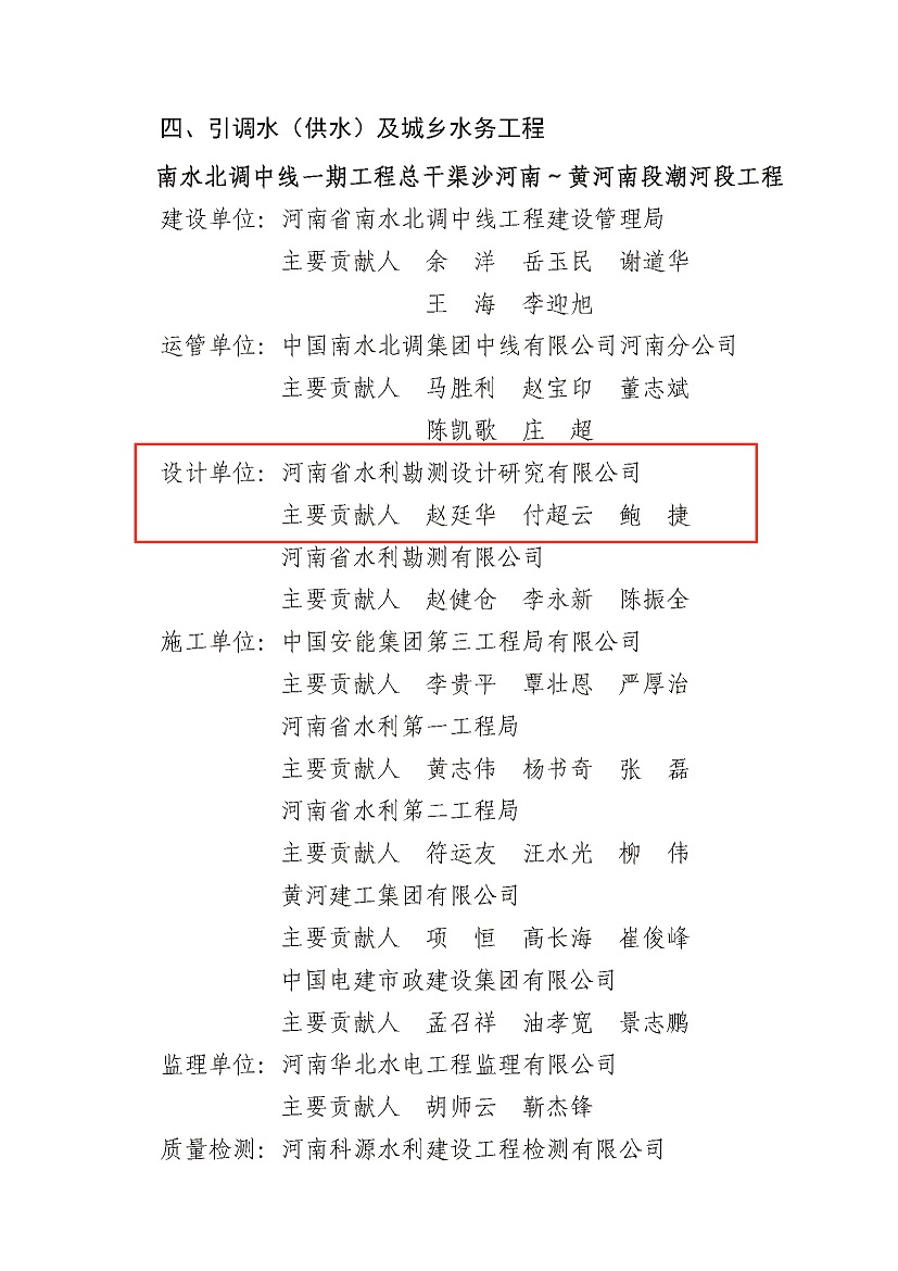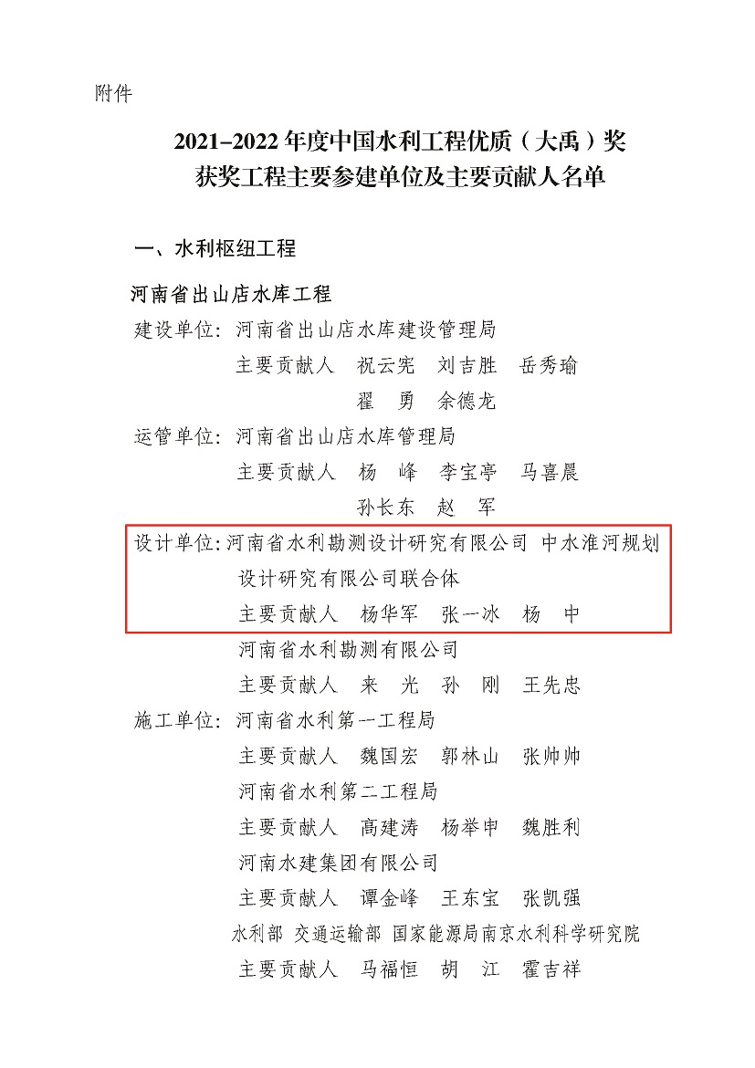 近日,經中國水利工程優(yōu)質(大禹)獎評審委員會評審及公示,公司參與設計的《河南省出山店水庫工程》《南水北調中線一期工程總干渠沙河南~黃河南段潮河段工程》《南水北調中線一期工程總干渠沙河南至黃河南段寶豐至郟縣段設計單元工程》三項工程榮獲2021-2022年度中國水利工程優(yōu)質(大禹)獎。